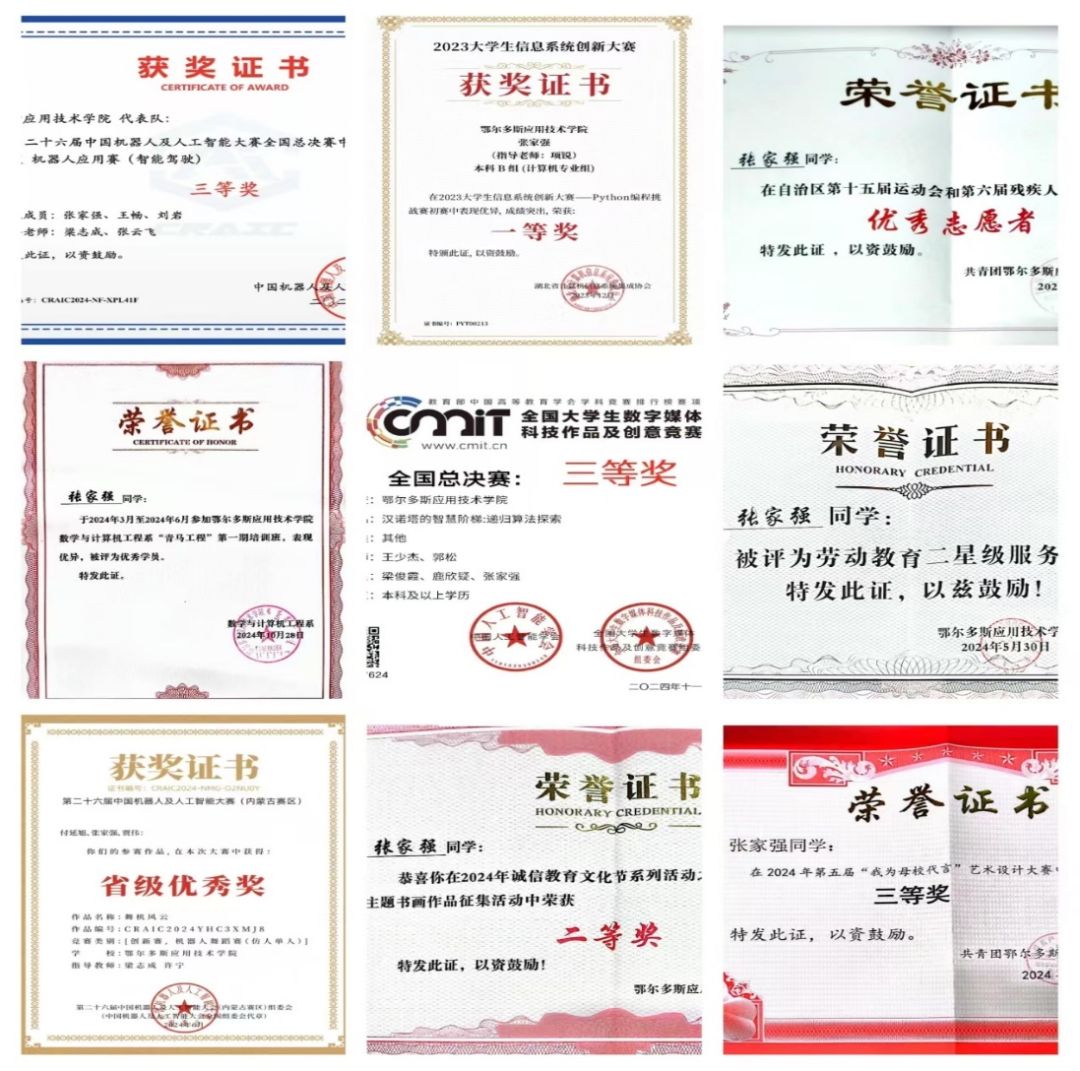 張家強,男,中共預備黨員,數學與計算機工程學院2022級數據科學與大數據技術班學生。現擔任學校學生黨建先鋒工程先鋒班數學與計算機工程系學習委員,機器人與人工智能社團副社長。榮獲國家獎學金、勞動教育二星級服務者、數學與計算機工程系“青馬工程”第一期培訓班優秀學員、自治區第十五屆運動會和第六屆殘疾人運動會優秀志愿者等榮譽稱號。競賽領域榮獲二十六屆中國機器人及人工智能大賽機器人應用賽全國總決賽三等獎、2024第十二屆全國大學生數字媒體科技作品及創意競賽全國總決賽三等獎、2024睿抗機器人開發者大賽CAIP信息技術創新賽道大數據賽項全國總決賽三等獎、二十六屆中國機器人及人工智能大賽機器人舞蹈賽省級優秀獎、2023大學生信息系統創新大賽—Python編程挑戰賽初賽一等獎、2024年誠信教育文化節系列活動之“助學·筑夢·鑄人”主題書畫作品二等獎、2024年上半學期課外體育鍛煉二等獎、2024年第五屆“我為母校代言“藝術設計大賽海報賽道三等獎等多項獎項。