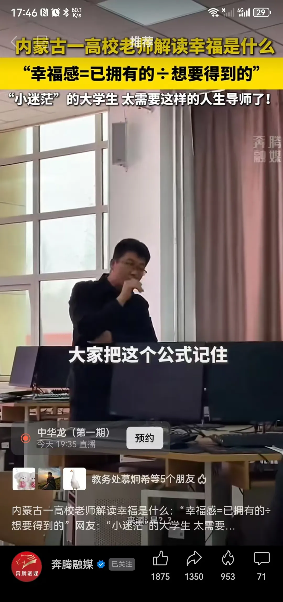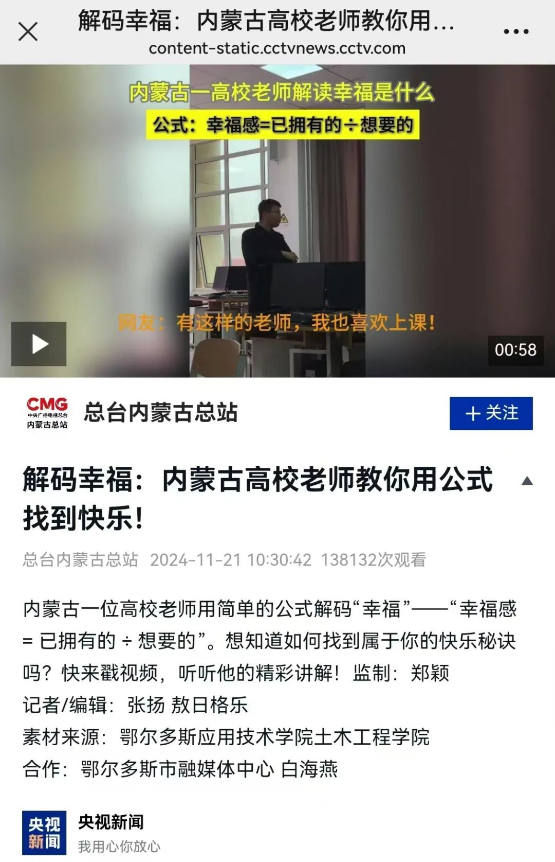 近日,一條#內蒙古一高校老師解讀幸福是什么#的短視頻,被央視新聞總臺內蒙古總站、央視頻、奔騰融媒、暖新聞等多家社交媒體平臺和短視頻平臺關注轉發,收獲眾多網友點贊。這條視頻當中的老師就是我校土木工程學院教師賈永豐。