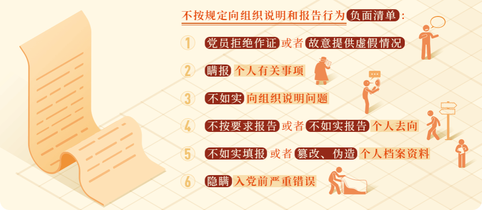 《中國共產黨紀律處分條例》第八十條、八十一條,對不按規定向組織說明和報告行為作出了處分規定,主要包括6類: