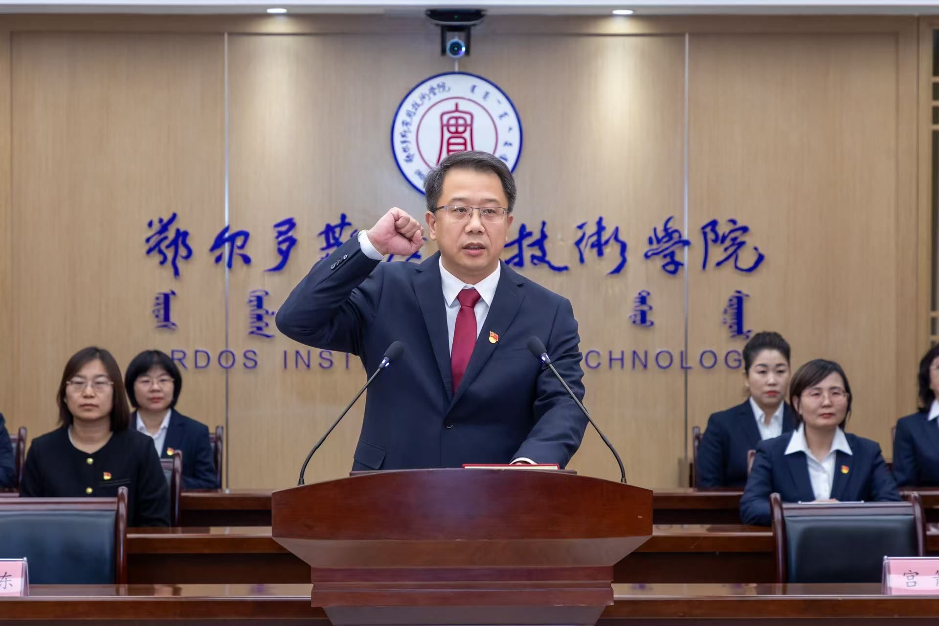 學校黨委書記李向東監誓并講話,黨委副書記、校長宮箭領誓,黨委副書記秦聞蘋主持。