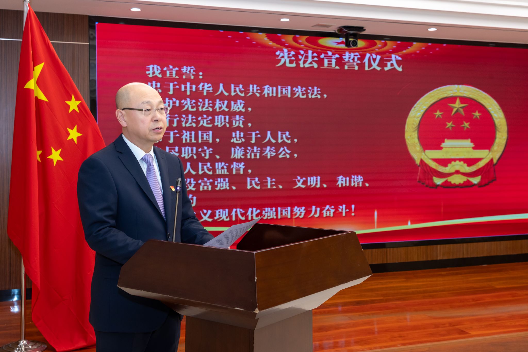 在雄壯的中華人民共和國國歌聲中,宣誓儀式開始。宮箭面向國旗和國徽,左手撫按憲法,右手舉拳,莊嚴宣讀誓詞,現場全體人員跟誦。