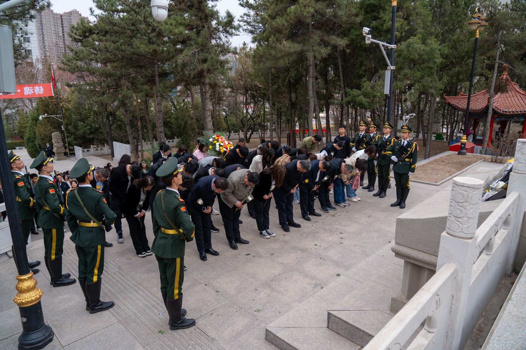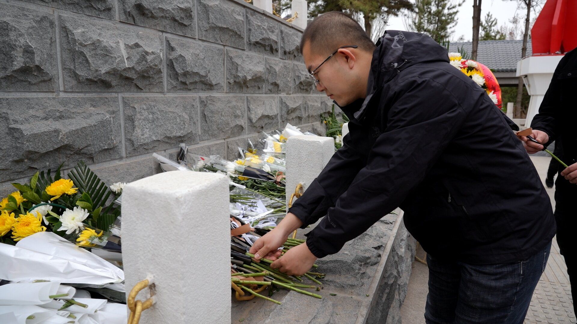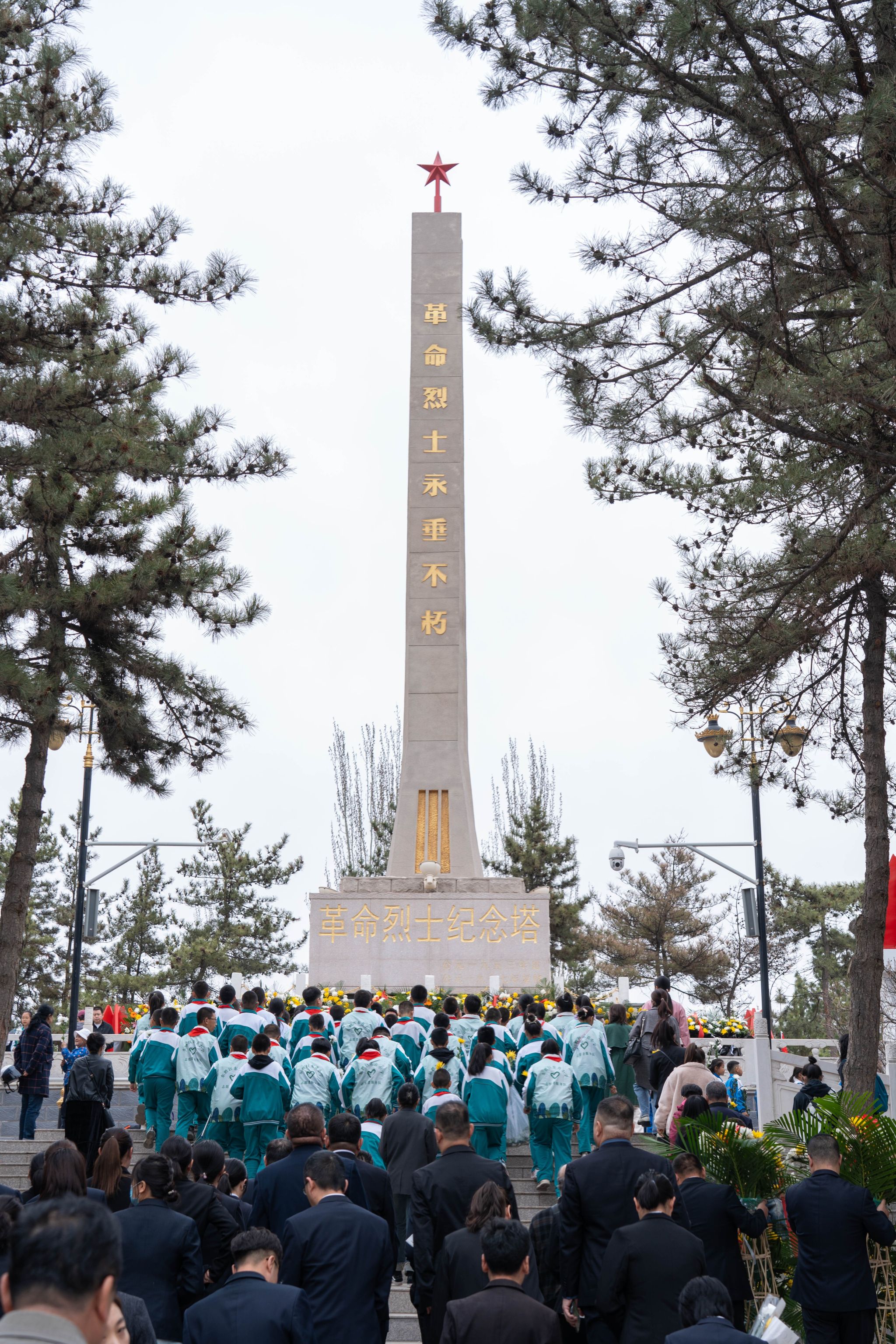 青山埋忠骨,遺志記心間。伴隨著國歌雄壯、激昂的旋律,全體師生用莊重、堅定的目光注目著五星紅旗,全體師生高唱《義勇軍進行曲》,向偉大祖國致以最崇高的敬意。松柏凝翠,素花含情。師生們列隊整齊、莊嚴肅穆,莊嚴肅立,在為民族獨立、人民解放、國家富強、人民幸福而英勇犧牲的烈士們的墓前肅立默哀,寄托對革命烈士的深切悼念和崇高敬意。