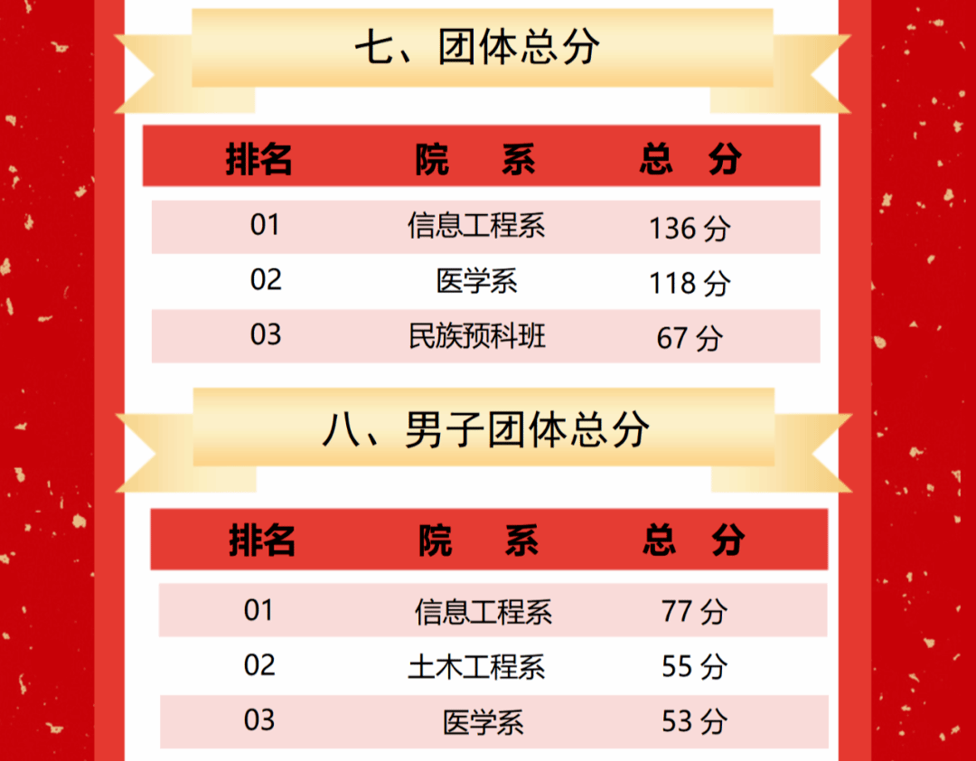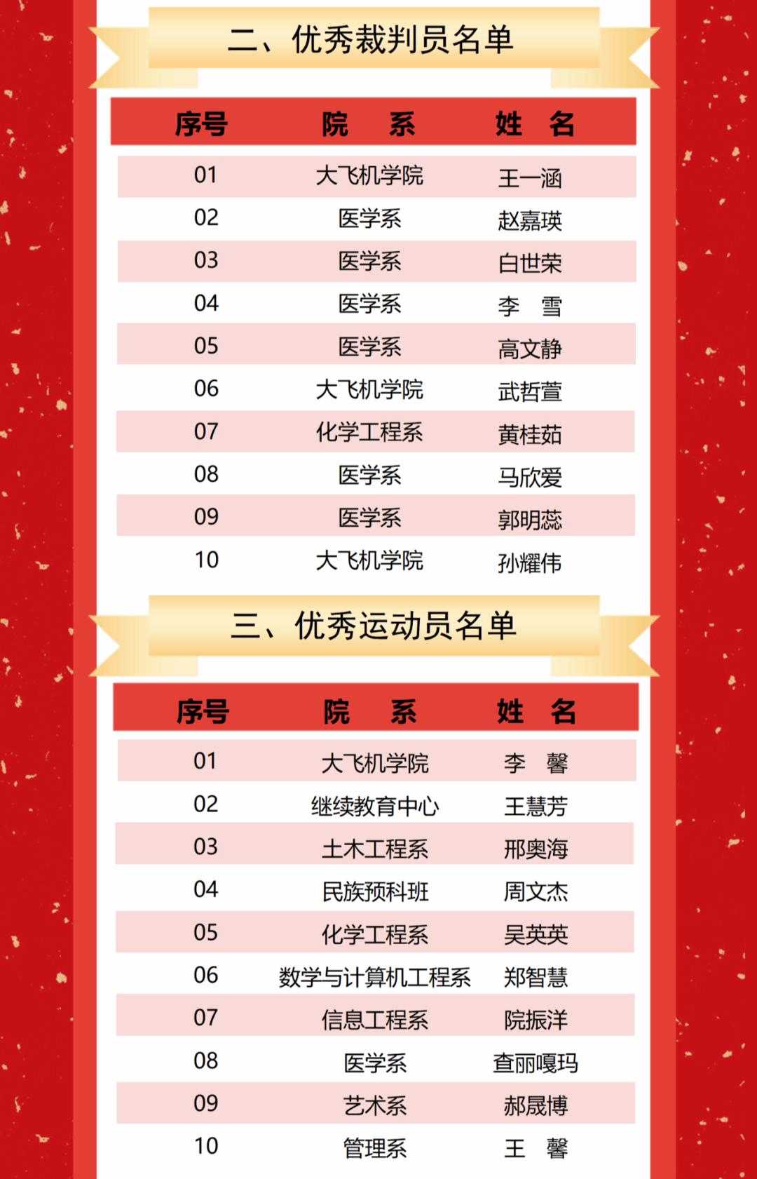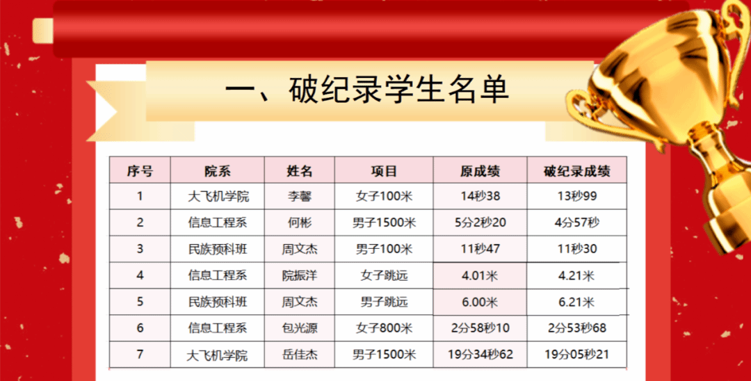 在這場體育盛會中,我校師生沐浴陽光,馳騁賽場,頑強拼搏,大會表彰了我校第六屆田徑運動會優勝團體、破紀錄學生、優秀裁判員、優秀運動員、課外體育鍛煉達人、體質健康測試優秀學生、精神文明先進代表隊。