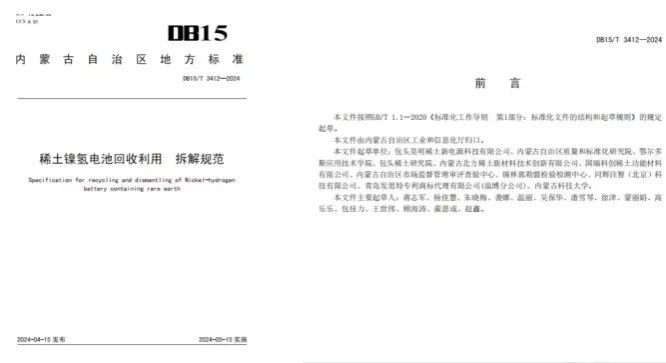 近期,我校首次主持的地方標準——化學工程系朱曉梅老師主持的內蒙古自治區地方標準《稀土鎳氫電池清潔生產規范》,以及學校參與的《稀土鎳氫電池回收利用拆解規范》、《稀土鎳氫電池技術成熟度評價》和《稀土鎳氫電池編碼規則》等4項標準于2024年4月15日發布,并于2024年5月15日實施。