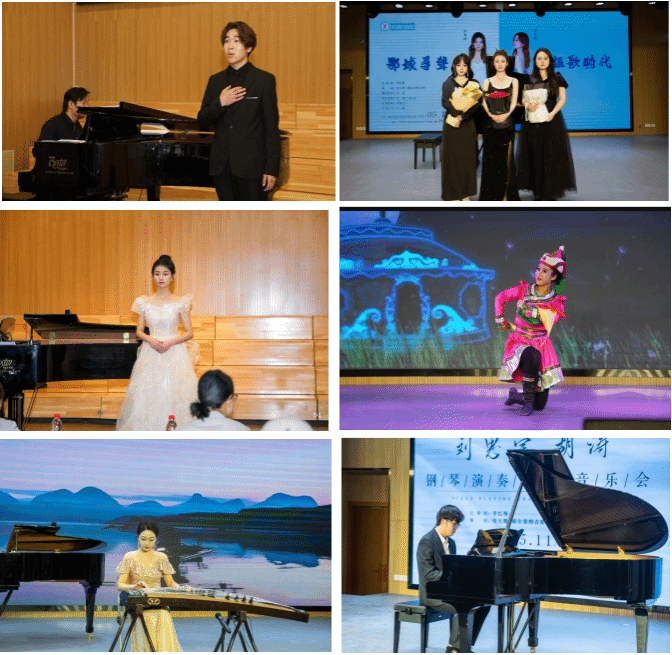 本屆畢業演出共舉辦系列音樂會41場,由美聲演唱、民族演唱、流行演唱、樂器彈唱、民族樂器演奏、西洋樂器演奏、民族舞蹈、現代舞蹈、獨舞、群舞等多種形式的藝術作品進行表演,其中聲樂演唱21場,器樂演奏13場,舞蹈表演7場。演出提升了學生駕馭舞臺的能力、團隊合作溝通協調能力、語言表達能力、舞臺表現力,這對于學生畢業后能夠更好地面對未來的挑戰有著重要意義。