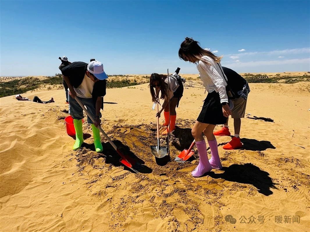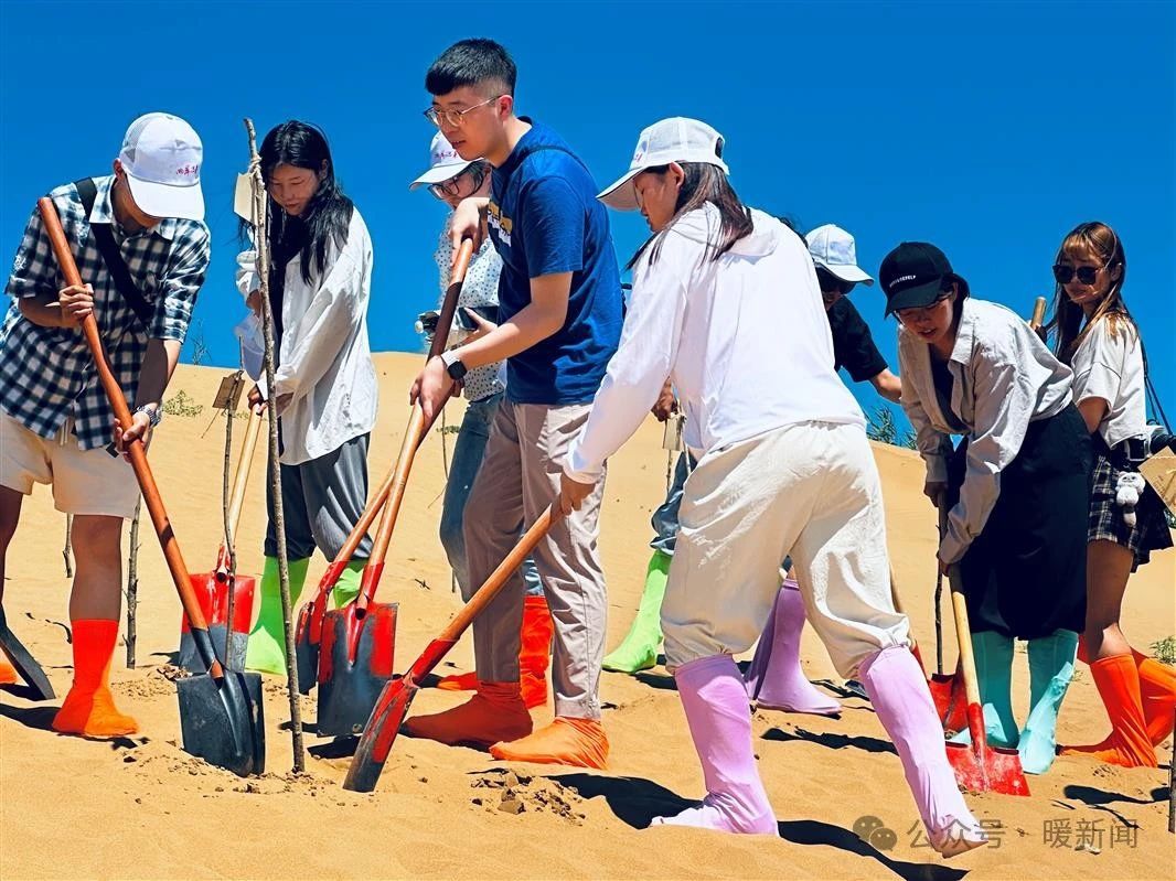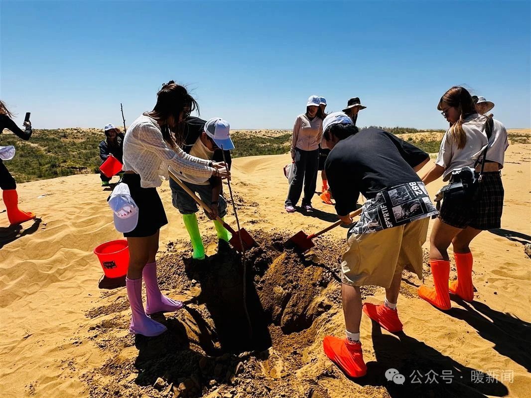 一望無(wú)際的沙海里,兩岸學(xué)生自由搭組干勁十足,有的揮鍬挖坑、有的扶正樹(shù)苗、有的培土填平,還有的提桶澆灌,種下一棵棵北京楊。