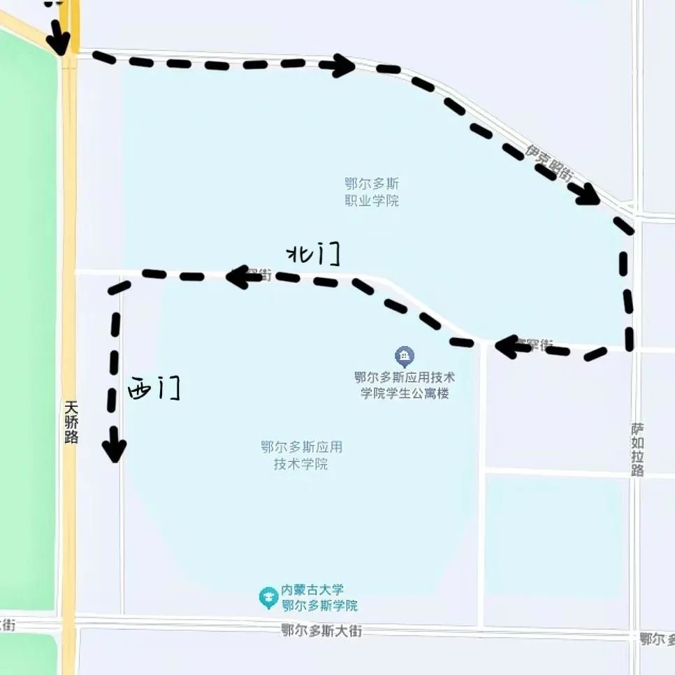 鄂爾多斯站向南→濱海東路→迎賓大道→通格朗北路→伊克昭街→薩如拉路→賽罕街→校西門小路