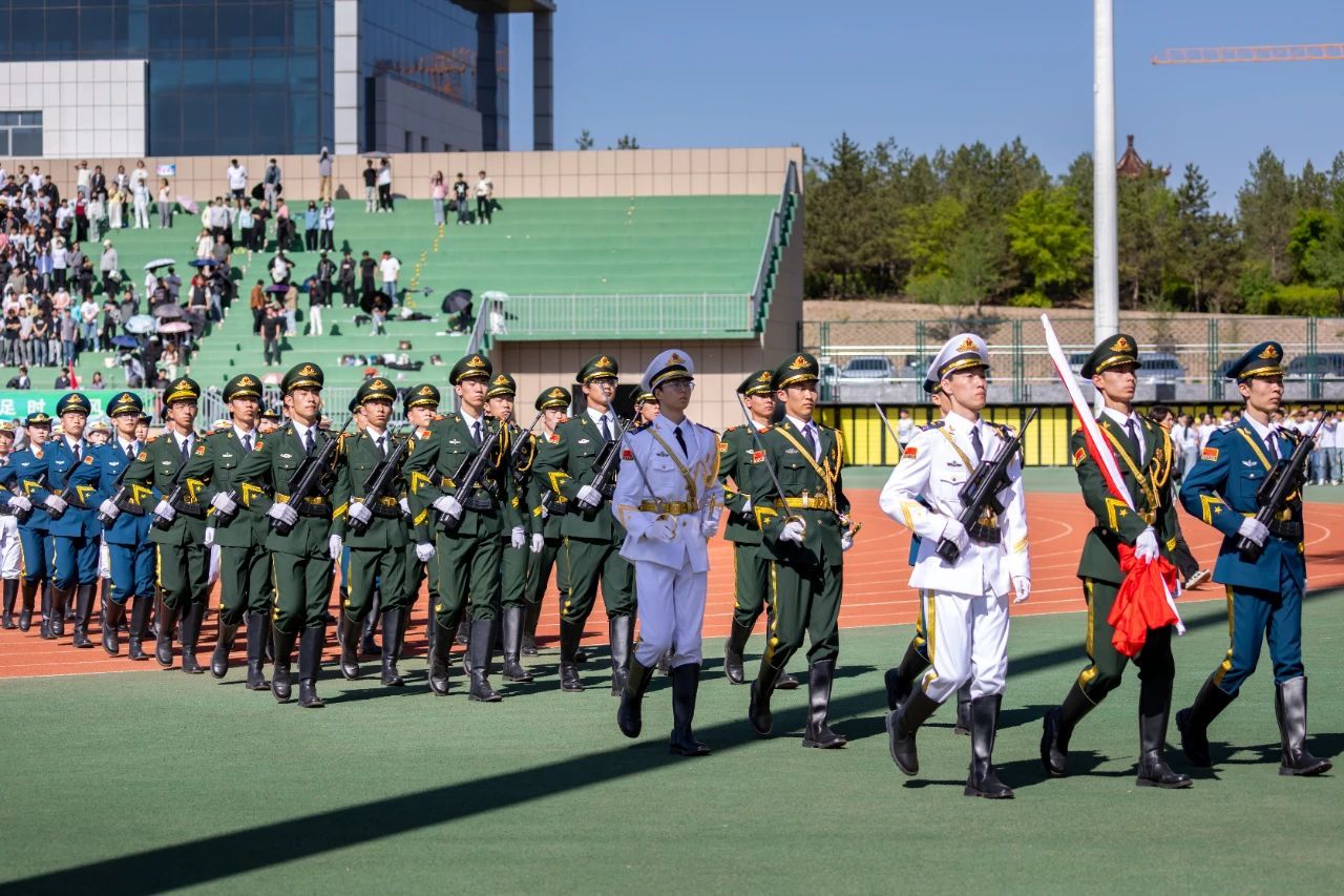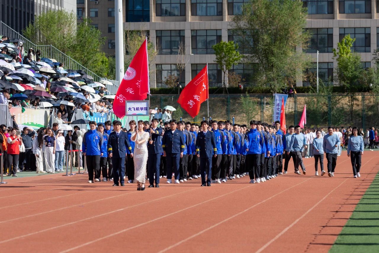 大飛機學院學子組成的彩旗方陣踏著鏗鏘步伐入場,翻飛的旗幟與青春面龐交相輝映,盡展航空學子凌云壯志。
