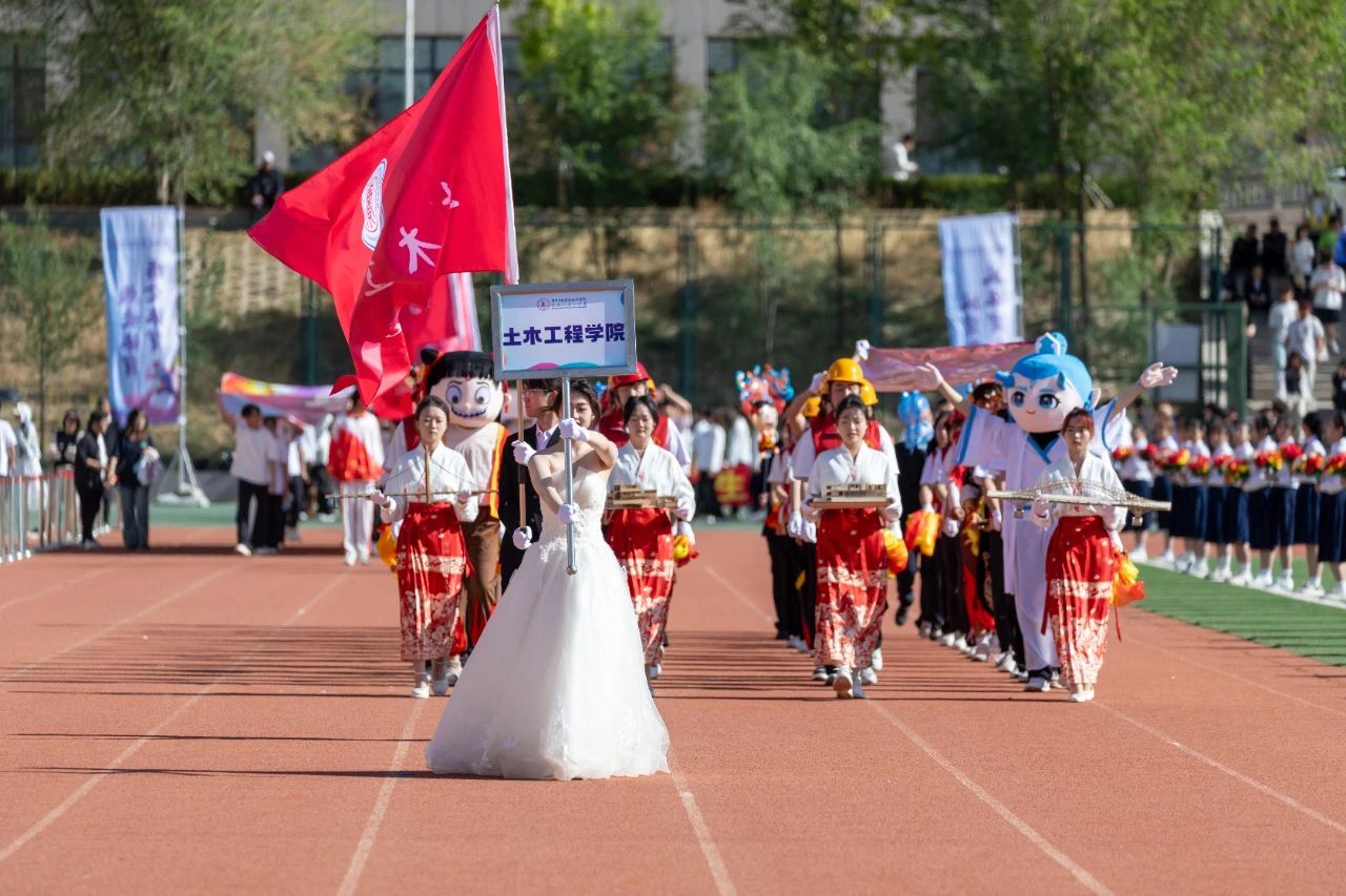 “十年筑基、百年樹人、砼心筑夢、山河見證”,土木工程學院方陣身著橙色安全制服、頭戴工程盔,手持測繪儀與建筑模型,展現出鄂應院學子的專業自信。
