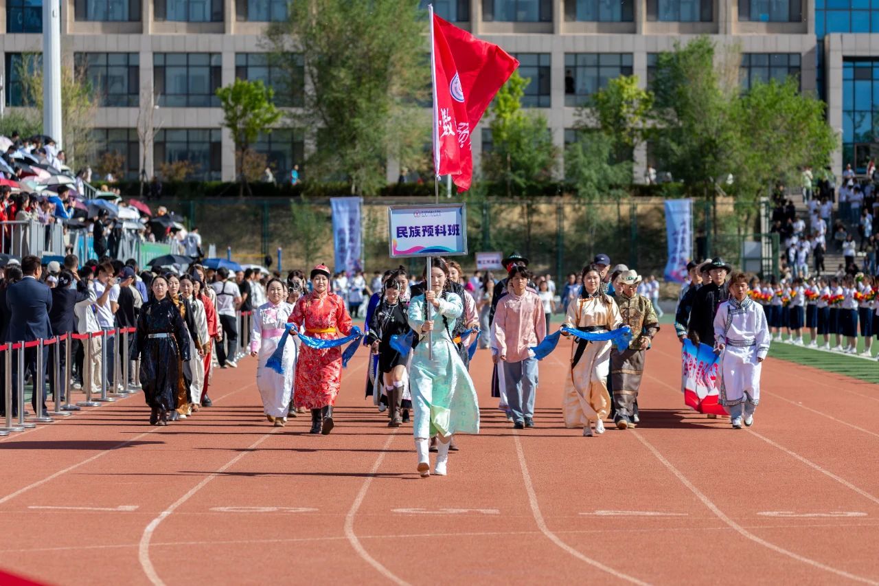 “五彩服飾展風情,同心共筑中國夢”,少數民族預科班方陣身著各民族服飾,如同一幅絢麗多彩的民族畫卷,展現民族團結風采。