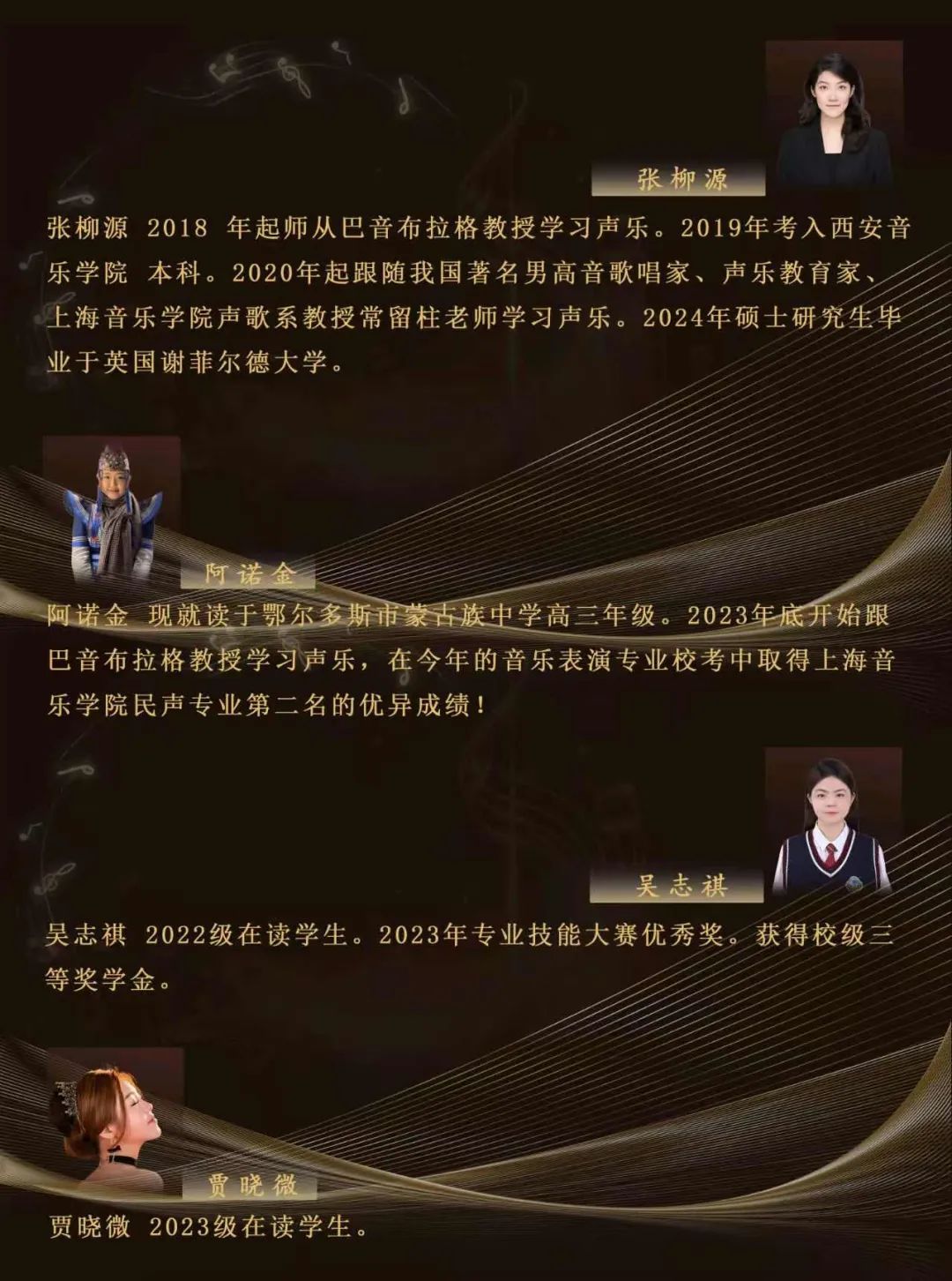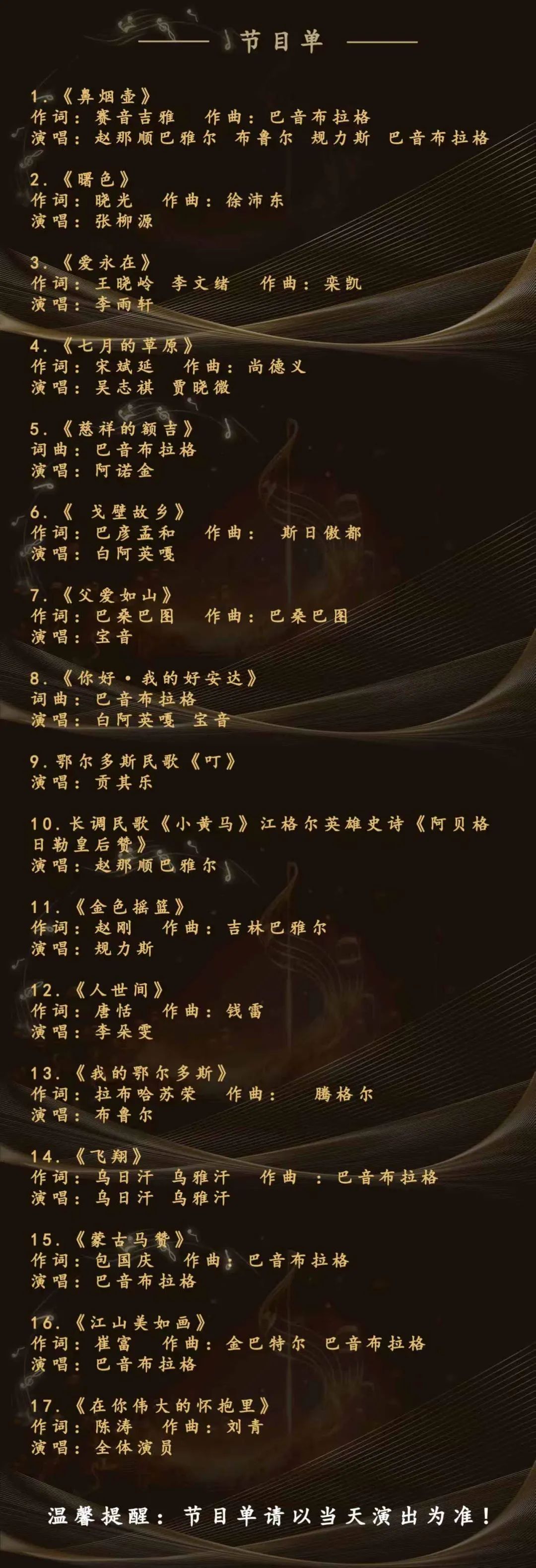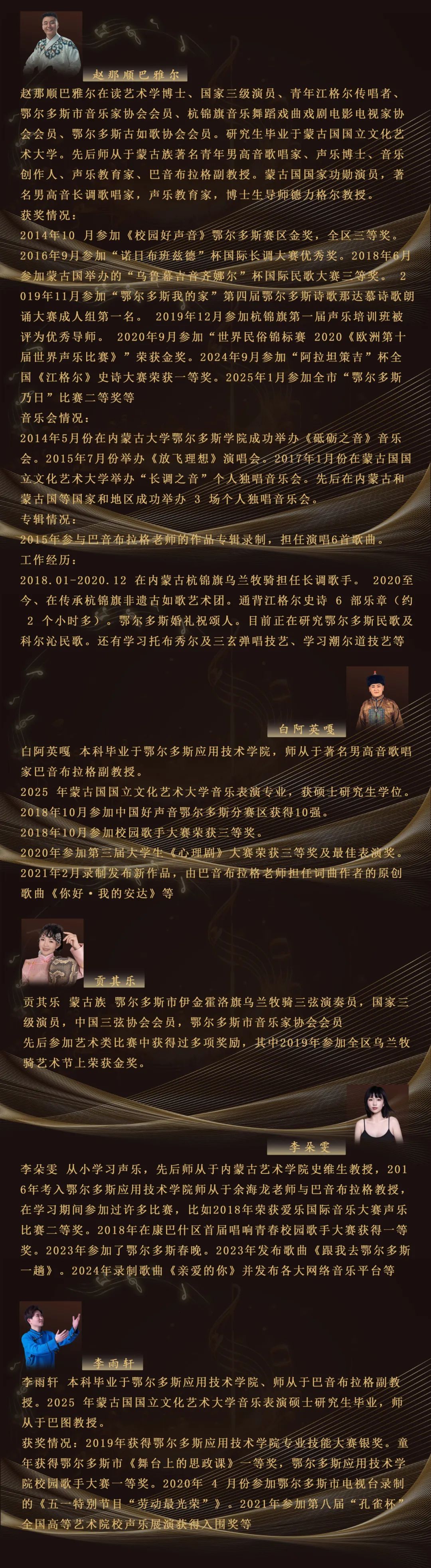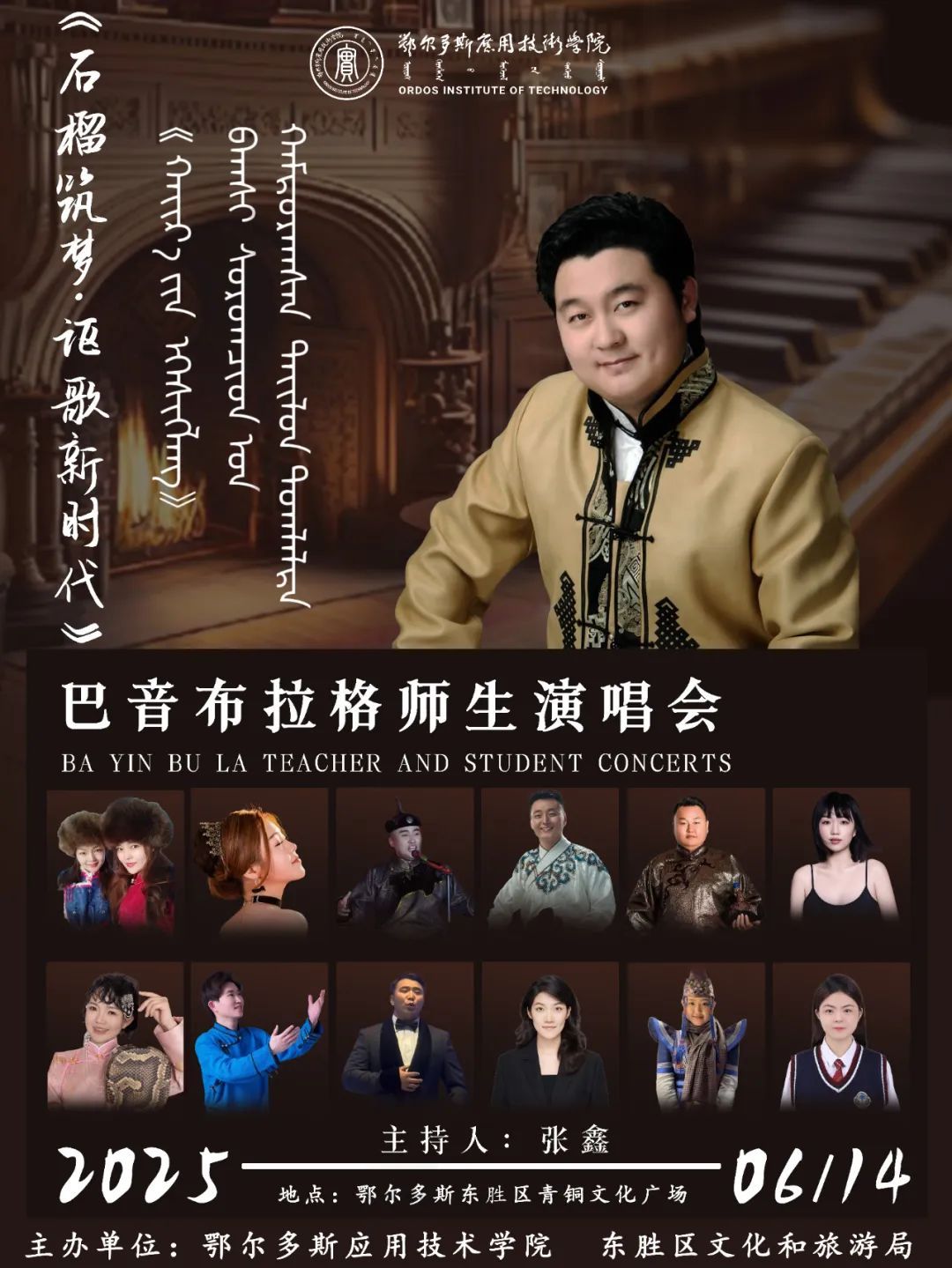 巴音布拉格副教授攜一眾優秀師生、歌唱家登臺為大家呈現精彩紛呈的演出,從在讀學生到資深演員,從民族音樂傳承者到跨界音樂人,覆蓋多代際、多風格,用歌聲串聯草原情懷與時代熱忱!這場演唱會不只是音樂表演,更是鄂爾多斯音樂教育成果的縮影。巴音布拉格團隊多年深耕,將專業教學與民族文化傳承結合,讓學生在舞臺實踐中理解“新時代謳歌”的意義,用作品架起傳統與現代、民族與世界的橋梁!